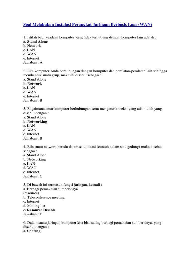 Contoh soal dan jawaban wan. Untuk mengkoneksikan jaringan lan dan wan dengan teknologi adsl biasanya digunakan sebuah perangkat dce yang berfungsi merubah sinyal digital menjadi analog ataupun sebaliknya. Soal dan jawaban desain wan by. Bila suatu network berada dalam satu lokasi contoh dalam satu gedung mak a disebut sebagai.